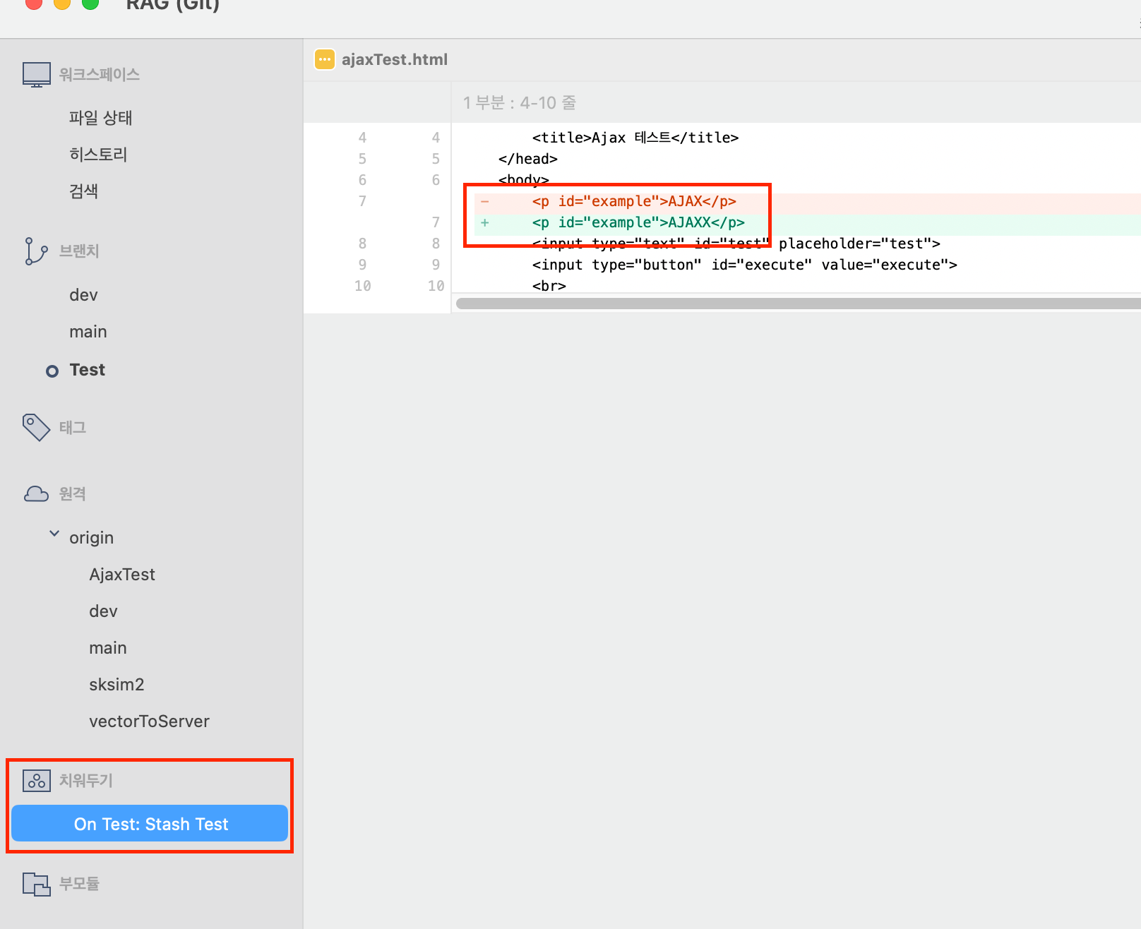 Stash 적용 후 이전에 저장한 사항(변경된)이 정상적으로 적용된 것을 볼 수 있다.