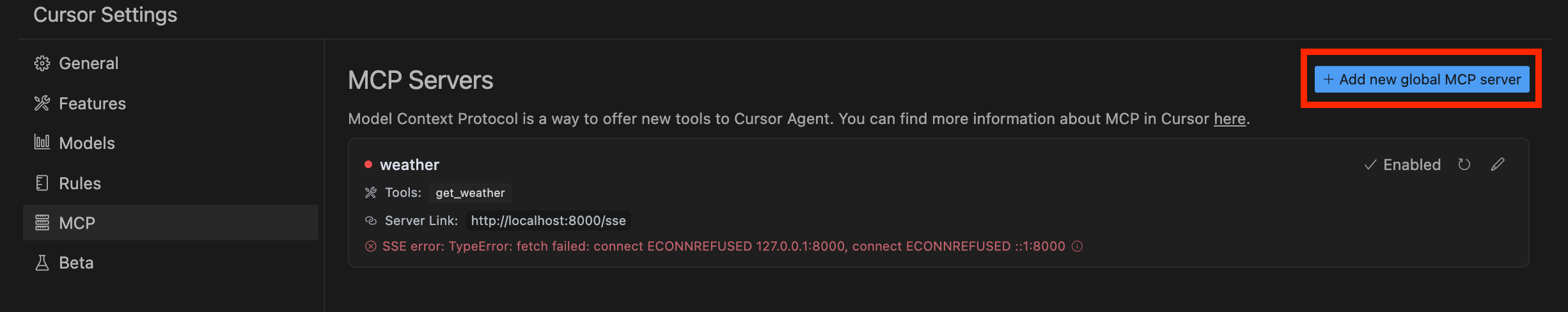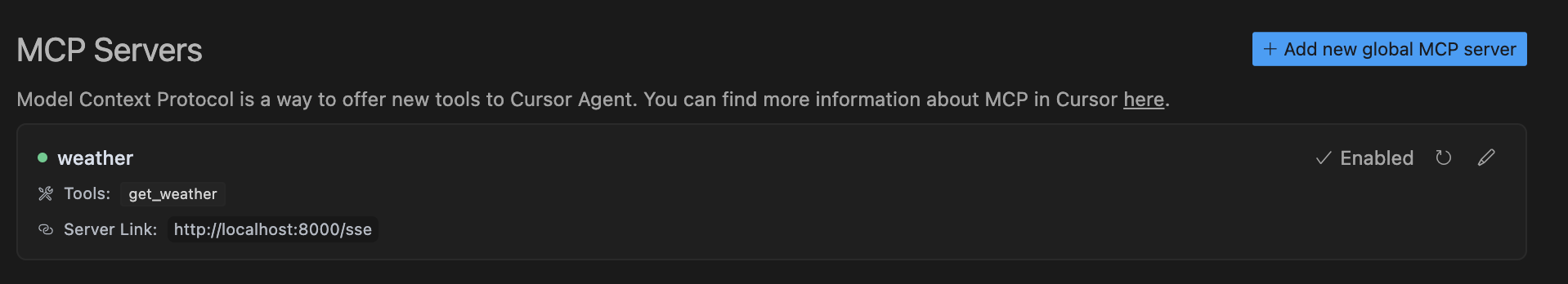 Add new global MCP server 를 통해 MCP 서버를 생성합니다.