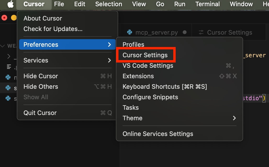 Curser AI의 MCP 설정으로 접근합니다.