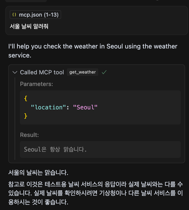 - mcp_server.py 에서 매서드를 통해 반환값을 "항상 맑습니다" 라고 적었기 때문에 아래와 같이 수행합니다.
