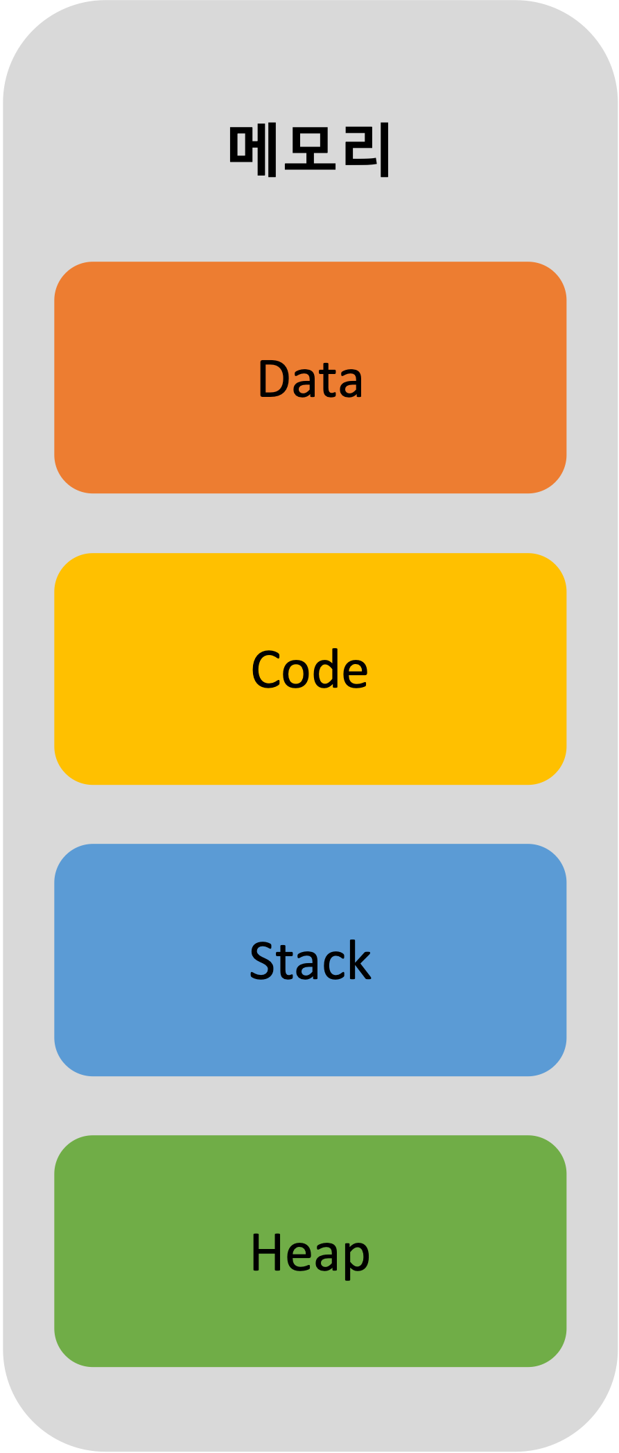 운영체제(OS)는 메모리에 공간을 할당을 해줍니다. 대표적으로 아래와 같이 4가지로 나뉘어져 있습니다.